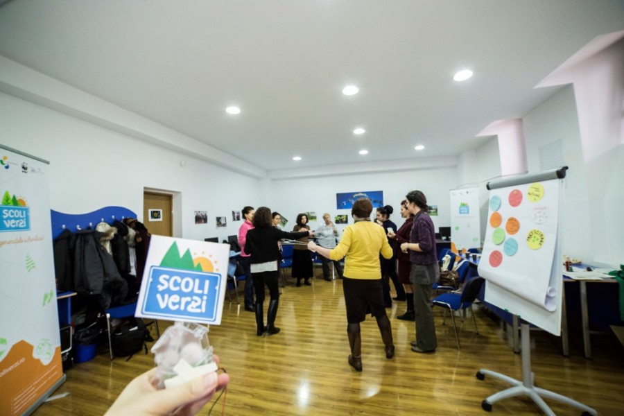 Scopul discuţiei din 11 decembrie 2014 a fost acela de a ne cunoaște mai bine cu profesoarele din București și de a le pregăti pentru rolul practic de promotoare ale proiectului și cursului opțional „Eco educație pentru Şcoli Verzi”. Colegele noastre formatoare, Cătălina Murariu și Felicia Ienculescu-Popovici, au prezentat Platforma Şcoli Verzi, viziunea proiectului asupra eco-educației, kitul educativ și stadiul în care se află acesta. De asemenea, au discutat despre serviciile de mediu și amprenta ecologică și au explicat conceptul de educație experiențială. Un accent deosebit s-a pus pe rolul profesorului în Platforma Şcoli Verzi, planul de diseminare a formulei de eco-educație propusă de proiect și pașii următori pe agenda Şcoli Verzi. Şi, pentru că promovăm învăţarea experienţială, am presărat şi această sesiune de instruire cu aplicații practice, exerciții și jocuri pentru relaxare și cunoaştere, precum şi un tur al Şcolii Ferdinand I. Niciun prilej de networking nu se ratează, aşa că profesoarele prezente au avut timp şi pentru fotografii şi să-şi împărtăşească din poveştile şi experienţele lor, în timpul prânzului delicios cu bucate lacto-vegetariene și de post.